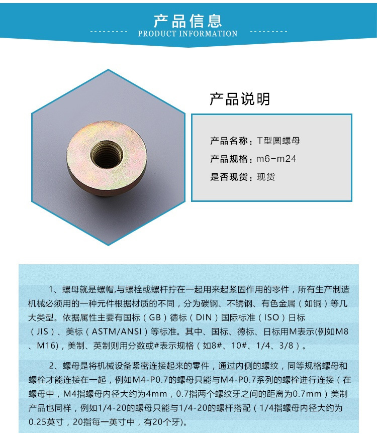 多用于螺紋鎖緊止推,多為細牙螺紋常用于直徑較大的連接。小T型圓螺母用于外徑與厚度較小的結構緊湊的連接。