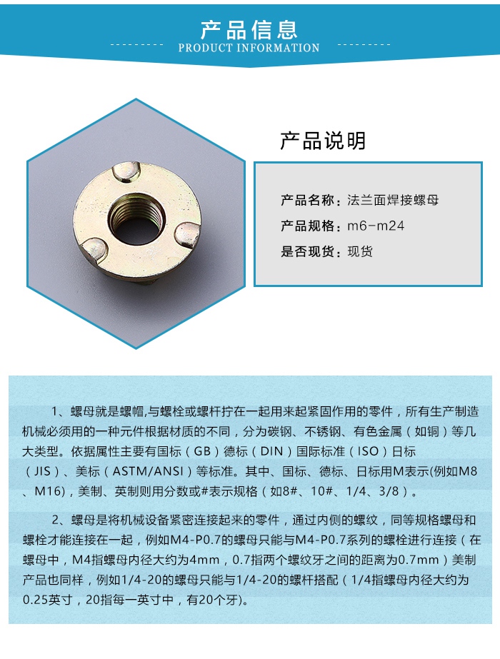 法蘭面焊接螺母的強(qiáng)度大,不易松脫,但在使用過程中還需要注意一些事項(xiàng),以便法蘭面焊接螺母連接使用。所謂焊接就是把兩個(gè)分離件變成一個(gè)整體,用高溫將金屬融化后混合到一起在冷卻,中間會(huì)加入合金,內(nèi)部是分子力的作用,要比一般母體輕度大。因此法蘭面焊接螺母的使用非常廣泛。
