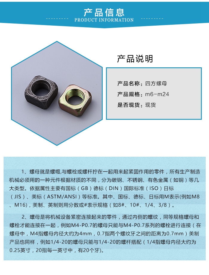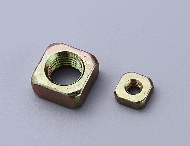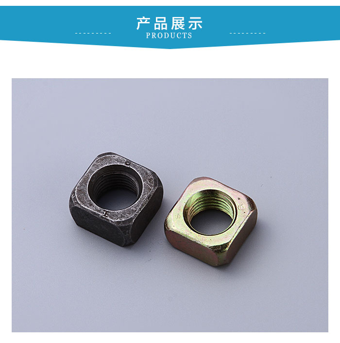 方形螺母表面處理采用:電鍍白鋅,藍白鋅,五彩鋅,發(fā)黑,本色五種表面處理方式可選。