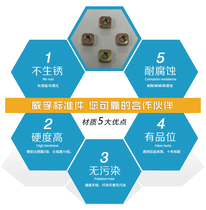 不同種類的螺母的作用不同,適合的環(huán)境也不相同。WF003方螺母也是一樣,普通的螺母是六角形的,在使用一些扳手去緊固的時候能旋轉(zhuǎn)的角度是比較小的,如果在一些有局限的空間使用六角螺母是很吃力的。這就用到WF003方螺母了,WF003方螺母的緊固旋轉(zhuǎn)角度大,很容易就安裝了。
