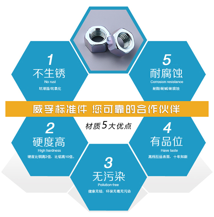 高性能WF004六角螺母由螺母本體和底盤組成,螺母本體為六角棱柱狀,WF004六角螺母本體中間部位設(shè)有圓形狀通孔,圓形狀通孔上設(shè)有內(nèi)螺紋,螺母本體的一個(gè)側(cè)面上設(shè)有凸塊,該側(cè)面對(duì)立的側(cè)面上也設(shè)有凸塊,產(chǎn)品的凸塊設(shè)置在螺母本體側(cè)面的中間處,凸塊為圓柱狀,凸塊與螺母本體通過一次性加工而成;螺母本體下方設(shè)有底盤,產(chǎn)品的底盤為圓形狀,底盤中間部位為圓形空心狀,底盤中間空心部分上設(shè)有內(nèi)螺紋,產(chǎn)品的內(nèi)螺紋高度為底盤高度的1/2,底盤中間的空心部分與螺母本體上的圓形通孔大小一致且互相重疊;底盤的底面設(shè)有四個(gè)焊點(diǎn),焊點(diǎn)均勻分布在底盤下底面的外邊緣處,焊點(diǎn)為半球結(jié)構(gòu),焊點(diǎn)高度為1.5cm。本高性能焊接六角的牢固性得到了增強(qiáng)。