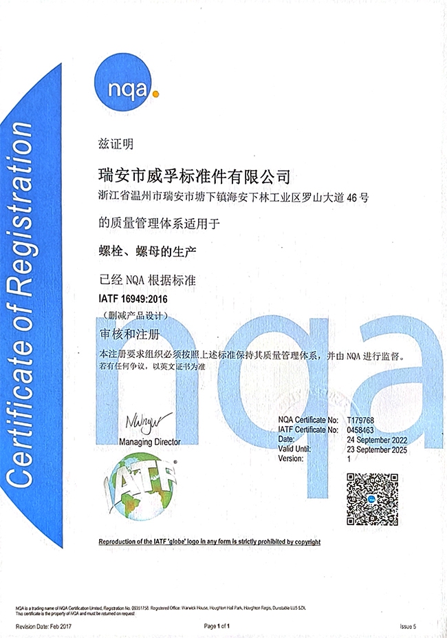 瑞安市威孚標準件有限公司專業(yè)生產防松螺母、鎖緊螺母,廣泛應用于汽車工業(yè)、機械制造、氣動工具、醫(yī)療設備、家具五金等領域,并深受國內外客戶的一致好評,為我公司取得了良好的質量信譽。